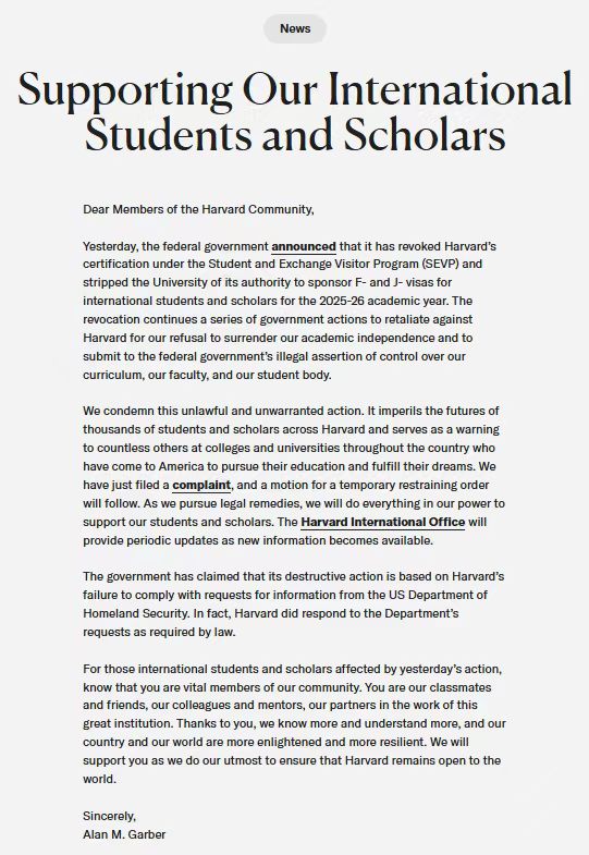 本月22日,美國國土安全部宣布取消哈佛大學(xué)獲得的學(xué)生和交流學(xué)者項(xiàng)目資質(zhì),禁止該校招收國際學(xué)生。23日,哈佛大學(xué)就這一政策起訴特朗普政府。校長加伯當(dāng)天在致哈佛社區(qū)成員的一封信中寫道:“我們譴責(zé)(‘禁招令’)這一非法且不當(dāng)?shù)男袨椤_@一行為危及哈佛大學(xué)數(shù)千名學(xué)生和學(xué)者的未來,也給全美各地高校眾多赴美求學(xué)、追求夢(mèng)想的學(xué)子敲響了警鐘?!?/p>